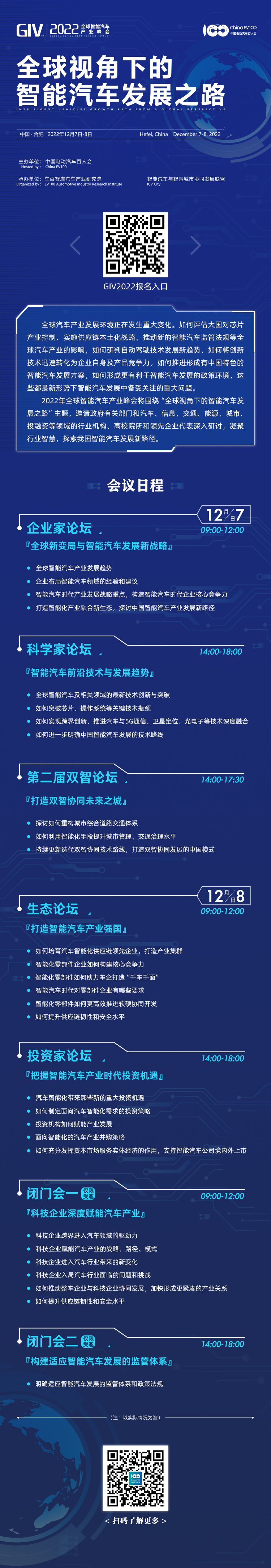 12月7日至8日,中国电动汽车百人会将在合肥举办全球智能汽车产业峰会(GIV2022)。来自政府主管部门、整车与零部件企业、高校院所研究机构及跨交通、信息、能源、城市、金融投资等诸多相关领域的代表将齐聚峰会,广开言路,共同探寻我国智能汽车发展新路径。
