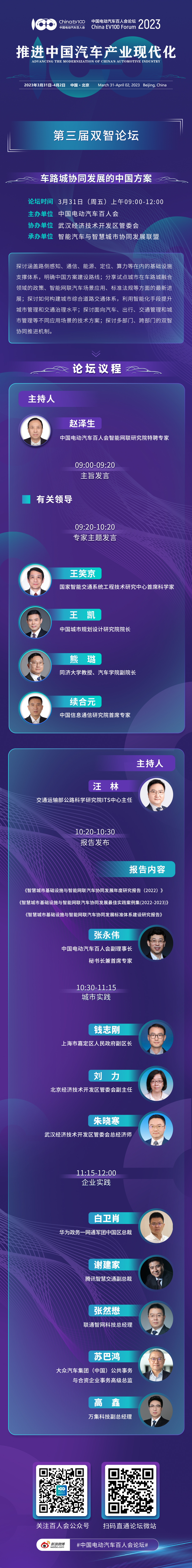 会议期间,试点城市代表将分享在车路城融合领域的政策、智能网联汽车场景应用、标准法规等方面的最新进展。同时,中国电动汽车百人会副理事长兼秘书长张永伟将发布《智慧城市基础设施与智能网联汽车协同发展年度研究报告(2022)》《智慧城市基础设施与智能网联汽车协同发展最佳实践案例集(2022-2023)》《智慧城市基础设施与智能网联汽车协同发展标准体系建设研究报告》等重磅报告,向行业汇报百人会在双智领域的最新研究成果。