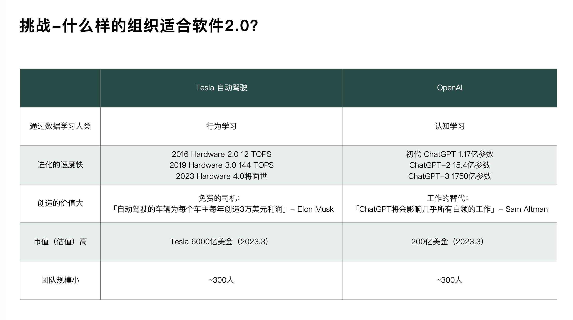 实际上,我们矩阵化组织的变革才刚刚开始,我认为至少到2025年才能实现完整的结果,因为组织变革不可能是一蹴而就的,甚至它的研发周期、推广周期比做产品、做平台周期长。但同时我们又面临了新的挑战,就是人工智能的大模型软件2.0到来了。让我们去看一看两家在这个领域中做得最好的公司是怎样做的。