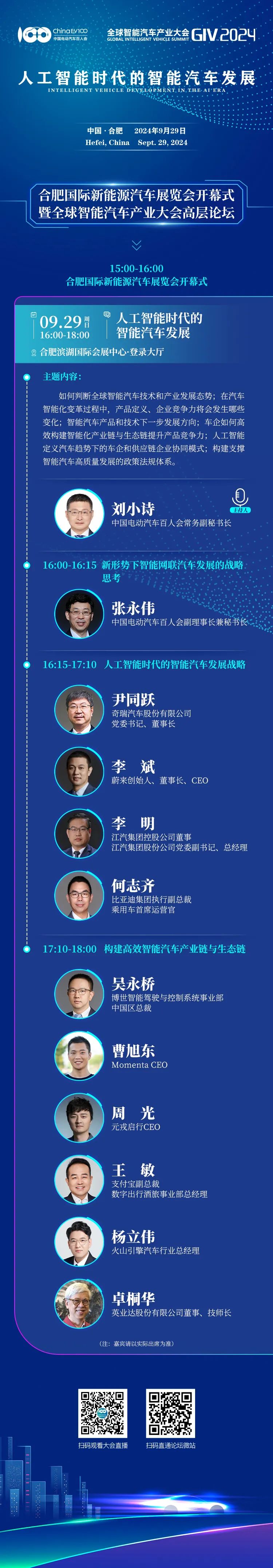 2024年9月29日,中国电动汽车百人会将在合肥举办全球智能汽车产业大会(GIV2024)。本届大会包括1场高层论坛、2场平行论坛,汇集来自政府有关部门和汽车、互联网、信息、人工智能等领域的行业机构、高校院所和领先企业代表,围绕 “人工智能时代的智能汽车发展” 主题,共同探讨人工智能加速迭代下,我国智能汽车高质量发展的路径。