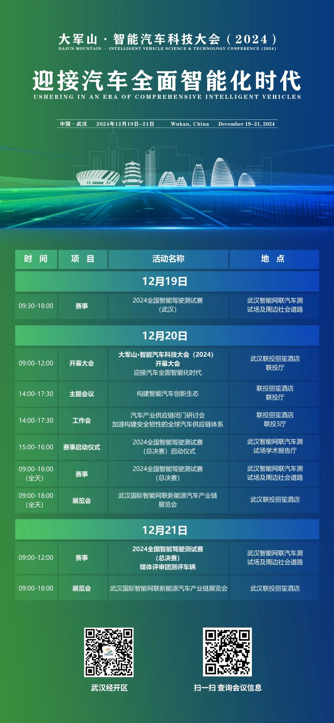会议同期还将举办2024武汉国际智能网联新能源汽车产业链展览会、2024全国智能驾驶测试赛(总决赛)、智能网联汽车体验、2024汽车产业链(武汉)深度对接等一系列专项活动,共同推动智能网联汽车的产业化发展。