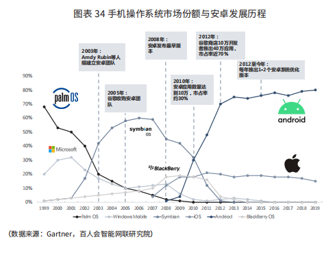 移动端设备方兴未艾的 21 世纪初 ,各大厂商纷纷在手机操作系统上发力,短时间内形成了塞班、Windows mobile、BlackBerry OS、Tizen、安卓和 ioS 几大阵营,然而在数年以后,其他手机操作系统的份额逐渐减少,形成安卓和 ioS “赢家通吃”竞争格局。