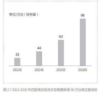 如果按照现有车桩比测算,要满足1300多万台高压快充需求,2023-2026年行业需要再增加98万台1000V高压直流桩。