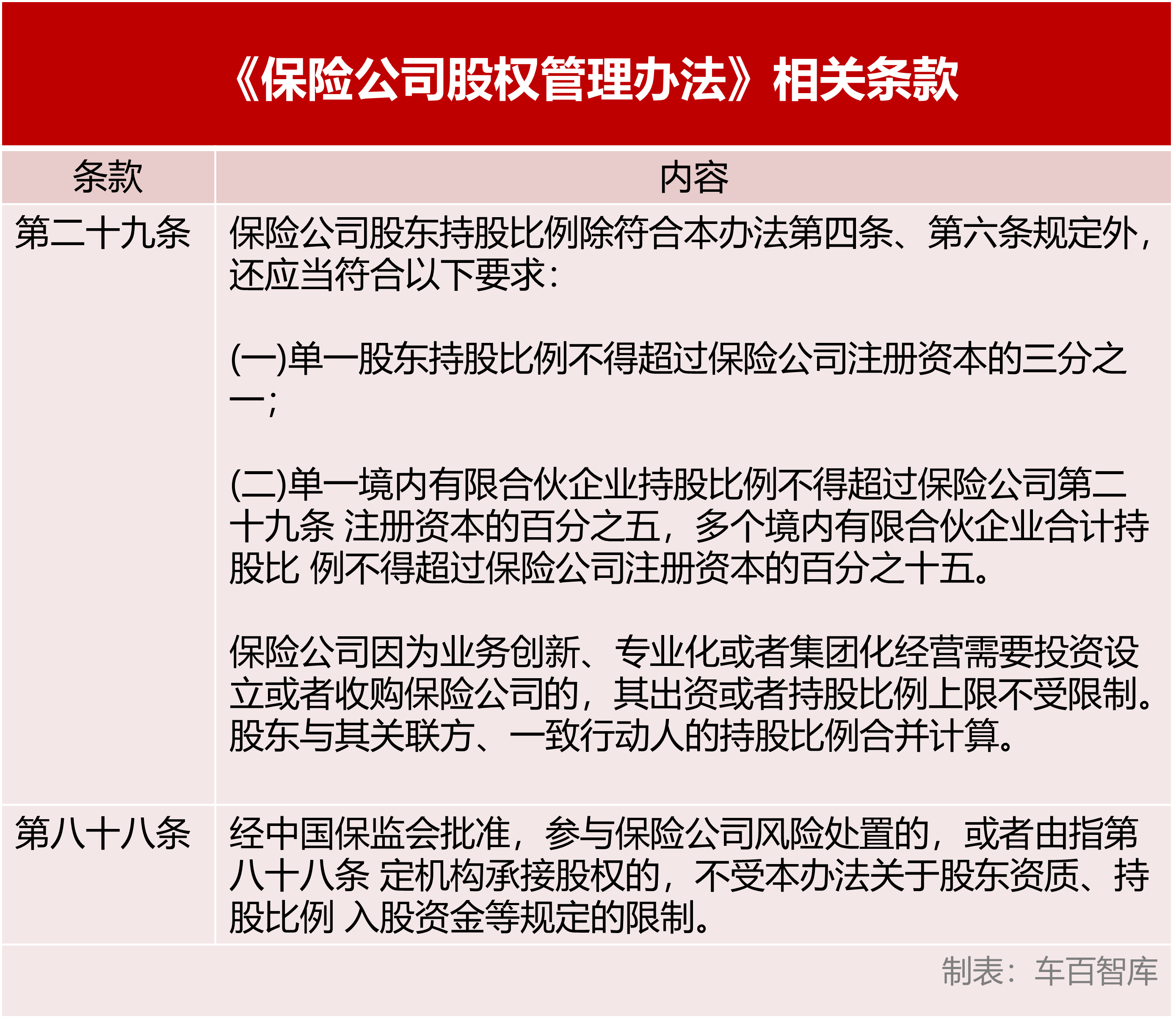 依据2018年修订的《保险公司股权管理办法》,中资保险公司第一大股东的股比不超三分之一。2021年3月,同为车企的吉利,以33.33%股权顶格入股合众财险,仅任第二大股东。不过,这项规定有一个例外情况,即参与保险公司风险处置的除外。比亚迪之所以能全资控股易安财险,是因其采取了重整易安财险这一“例外”的方式。