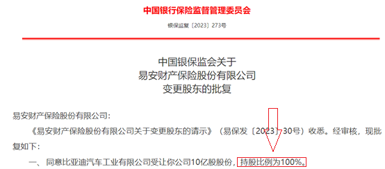 此前的5月6日,银保监会已经批复同意比亚迪控股子公司比亚迪汽车工业有限公司受让易安财险100%股权。这意味着,易安财险(比亚迪财险)成为比亚迪方面全资控股的保险公司,这是第一例民营股东独资的中资保险公司。