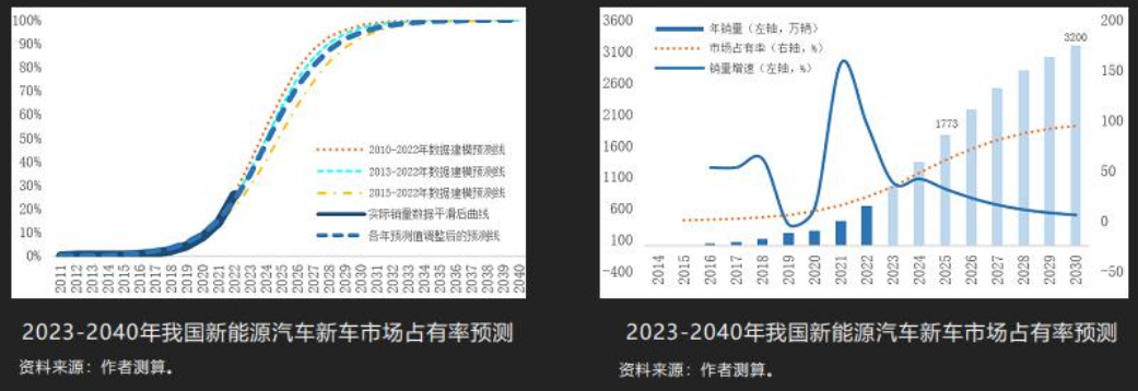 从2010年、2013年、2015年一直到2022年三个时间段,我们对整个市场占有率用这个模型去做一些分析,同时把以往新能源汽车的占有率做一个平滑。有时候会受到政策的影响,平滑以后就像左边这张图显示的,虚线部分可能是比较接近下一步整个市场占有率变化的方向。这种情况下,结合我们整个汽车市场的潜在增长率,对新能源汽车和燃油汽车做一个相对的拆分,大概到2025年的时候,我们判断新能源汽车的销量会到1700万辆左右,到2030年的时候市场占有率会突破90%,销量约为3200万辆左右。这个预测是我们研究的一个结果,希望能给大家研究工作提供一些参考。