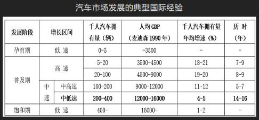 目前,汽车市场上,从民用汽车角度,我们的测算的千人汽车拥有量是221辆,公安部公布的是225辆,总之,整体已经超过了200辆的关口。超过这个关口之后,千人汽车拥有量的增速会出现明显回落。根据典型的发达经济体的经验,千人汽车拥有量在200辆到400辆的区间,增速会从11%—12%回落到4%—5%的水平,这个过程时间会比较长,发达国家普遍经历了15年左右时间。