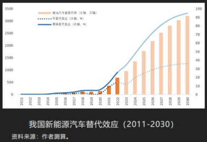 我们针对每一年对燃油汽车的替代效应以及累计对燃油汽车整体替代效应,都做了一些分析。到2025年,整体的替代效应在60%左右,到2030年突破94%。目前来看,一直到2027年,都处于替代效应最快的、最明显的发展阶段。