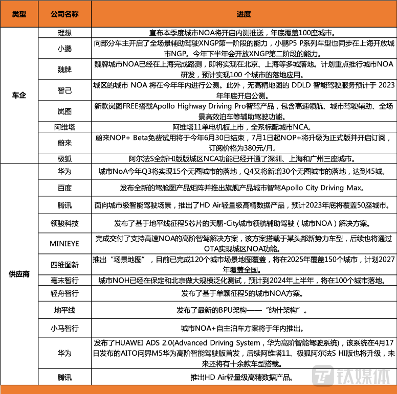 截至2023年4月,部分车企及供应商城市NOA进展? 图源:钛媒体