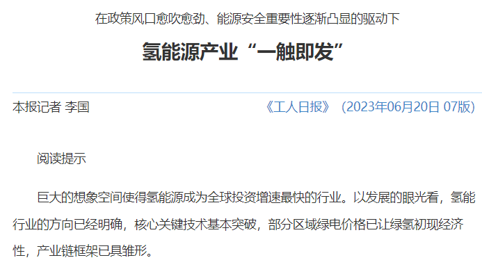 “氢能源产业,一触即发”,这是工人日报近期报道文章对氢能源产业的评价。该报道表示:“巨大的想象空间使得氢能源成为全球投资增速最快的行业”。而中信建投证券的研报也表示,氢能源板块有望进入明确投资窗口期。