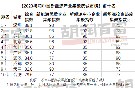 6月19日,胡润研究院发布《2023胡润中国新能源产业集聚度城市榜》,列出了新能源产业集聚度最高的中国城市50强。