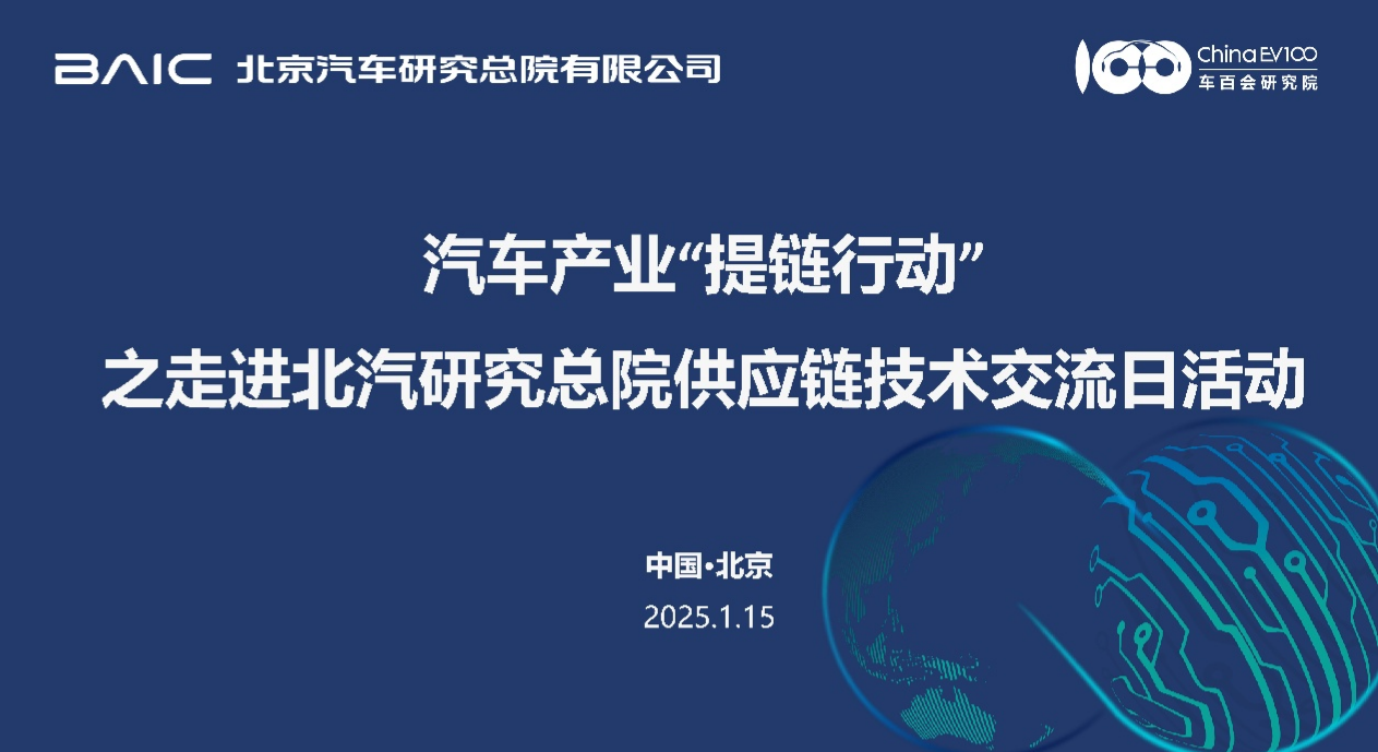 为促进汽车供应链上下游资源的高效合作,推动新产品、新技术商业化应用,更好地服务企业战略布局和行业协同发展,助力构建安全可靠的供应链体系,由北京汽车研究总院有限公司、车百会研究院主办,汽车产业供应链协同创新中心(简称S100)承办的汽车产业“提链行动”之走进北汽研究总院供应链技术交流日活动,将于2026年1月15日在北京举办。