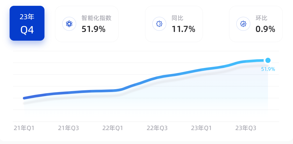 据车百在线数据显示,截至目前,新能源汽车市场2023年Q4智能化配置渗透率达51.9,同比增长11.7。
