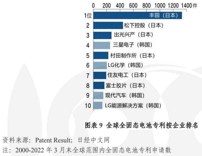 相较于日韩全固态电池专利布局全球领先,我国固态电池的竞争力并不强。根据全球全固态电池专利统计数据,前三名均由日本企业占据,其中丰田高居首位,专利申请数超过 1200 件,是第二名松下控股的3 倍左右;韩国三星电子和 LG 化学也在迅速追赶,其专利数与第三名出光兴产相差不大。