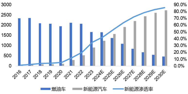 2030年,我国汽车市场将进入以电为主的时期。2024年上半年,我国新能源汽车销量494.4万辆,同比增长32%。2024年7月国内新能源乘用车单月零售渗透率首次超过50%,预计到2030年,中国新能源乘用车渗透率将超过70%。其中,插混与增程进一步推动了新能源汽车市场增长。2024年上半年PHEV与增程在新能源汽车中占比约40%,同比增长85.2%,增速高于纯电车型。2030年插混、增程在新能源汽车中的比例有望进一步提高到50%左右。
