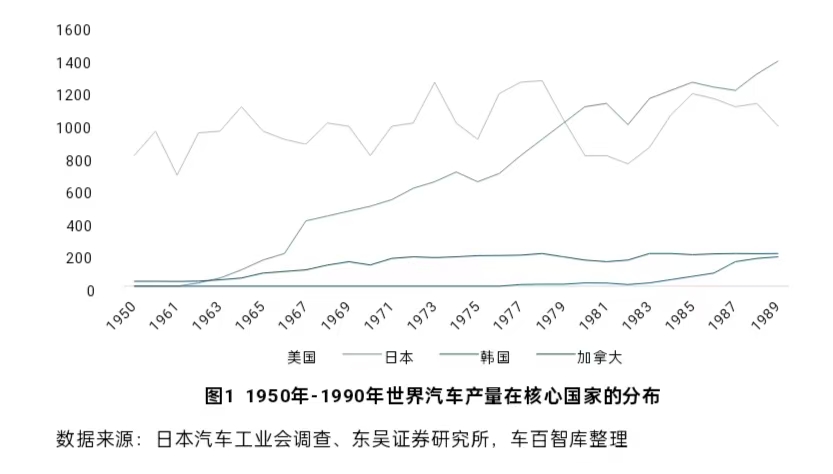 1980年日本汽车年产量首次突破1000万辆大关,一举超过美国成为世界第一汽车制造国。同年,日本出口美国汽车达到192万辆,占美国进口汽车的八成;在美国汽车市场,日本汽车份额占比高达20%。1990年,日本本土产量达到峰值1350万辆。
