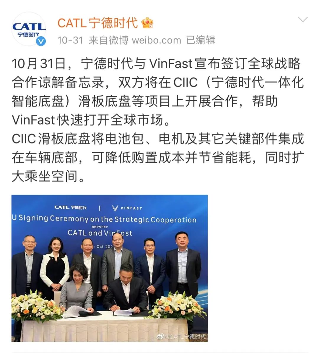 现如今宁德时代的一举一动,都可能影响动力电池,乃至新能源汽车江湖的竞争格局与未来走向。就在10月31日,宁德时代宣布,与越南车企VinFast签订全球战略合作谅解备忘录,将在CIIC(宁德时代一体化智能底盘)方面探索多种形式的合作,帮助VinFast快速打开全球市场。