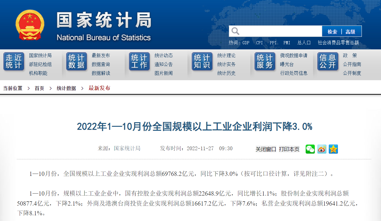 1—10月份,全国规模以上工业企业实现利润总额69768.2亿元,同比下降3.0%。