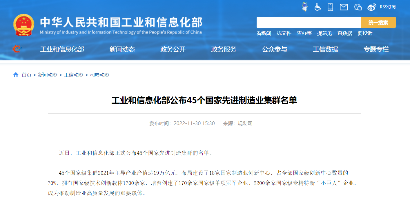 近日,工业和信息化部正式公布45个国家先进制造集群的名单。