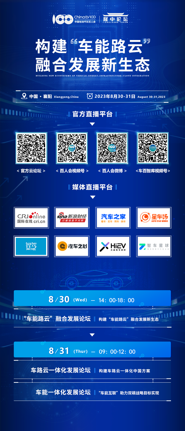 中国电动汽车百人会隆中论坛(2023)采用线上线下相结合的方式召开,为方便更多无法前往现场的观众和朋友了解会议情况,我们将通过中国电动汽车百人会官方微信公众号、官方微博、百人会论坛微站、车百智库订阅号四个官方平台进行线上直播,欢迎观看。