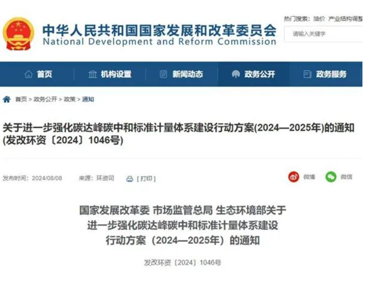 8月8日,国家发展改革委、市场监管总局、生态环境部联合发布《关于进一步强化碳达峰碳中和标准计量体系建设行动方案(2024—2025年)的通知》(以下简称“《行动方案》”)。