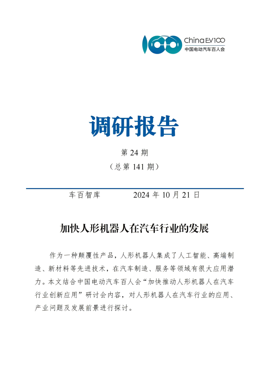 “作为一种颠覆性产品,人形机器人集成了人工智能、高端制造、新材料等先进技术,在汽车制造、服务等领域有很大应用潜力?!背蛋僦强庠?/span>第141期调研报告《加快人形机器人在汽车行业的发展》(以下简称“车百智库研报”)指出,在人形机器人和智能电动汽车产业的双重驱动下,汽车行业正迎来一场技术变革。