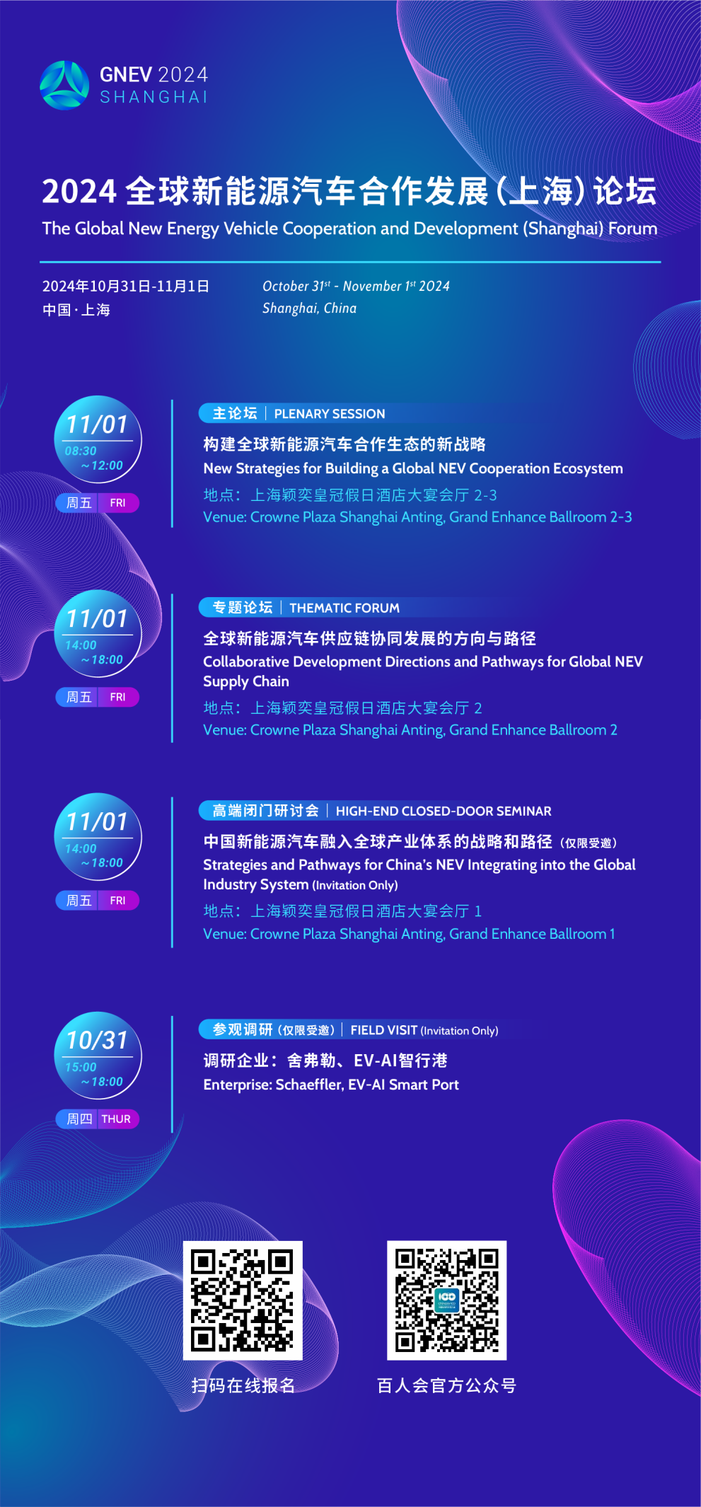 中国电动汽车百人会将于2024年10月31日至11月1日在上海举办全球新能源汽车合作发展(上海)论坛(GNEV2024?Shanghai),为帮助大家顺利参会,我们准备了线上和线下两种参会方式。