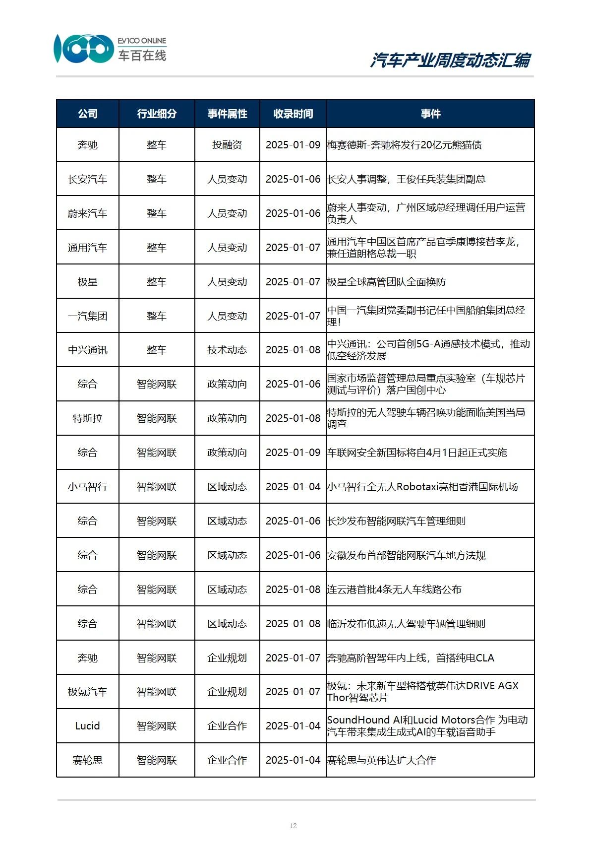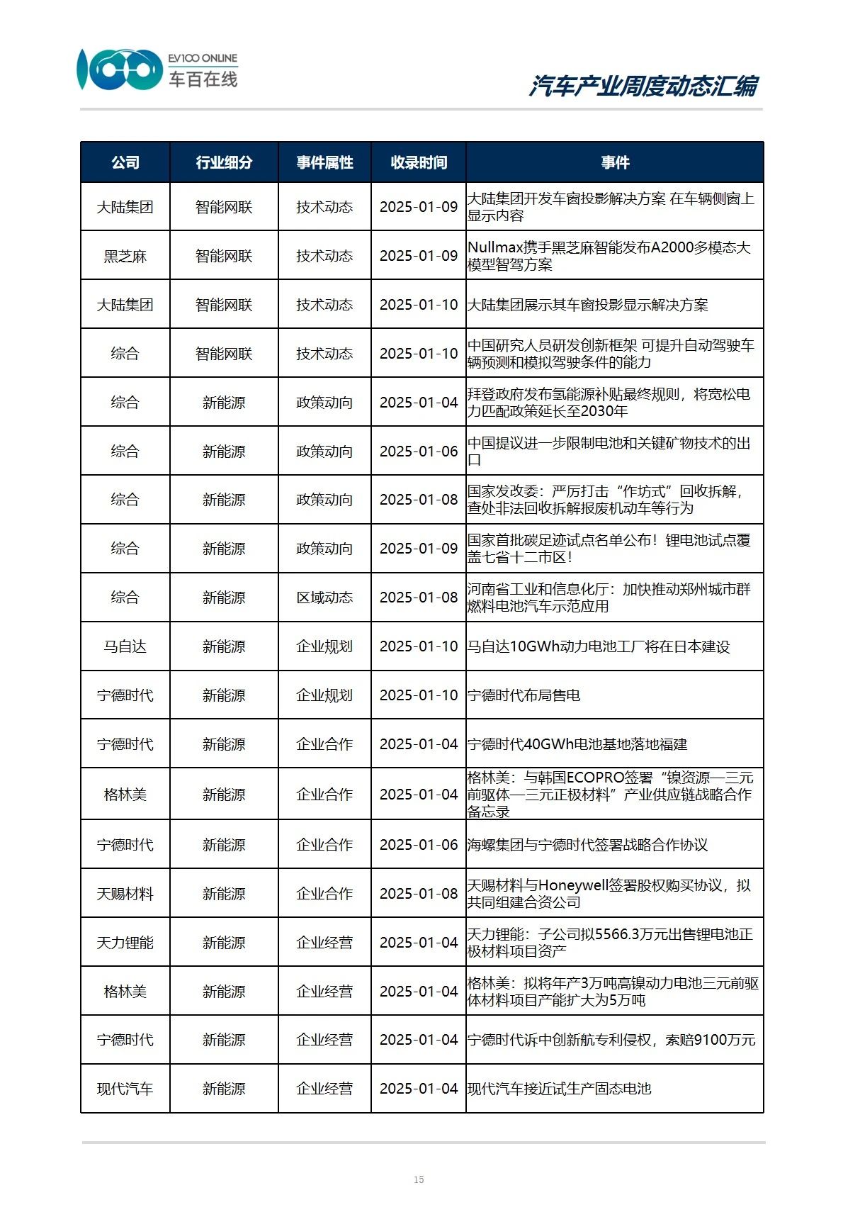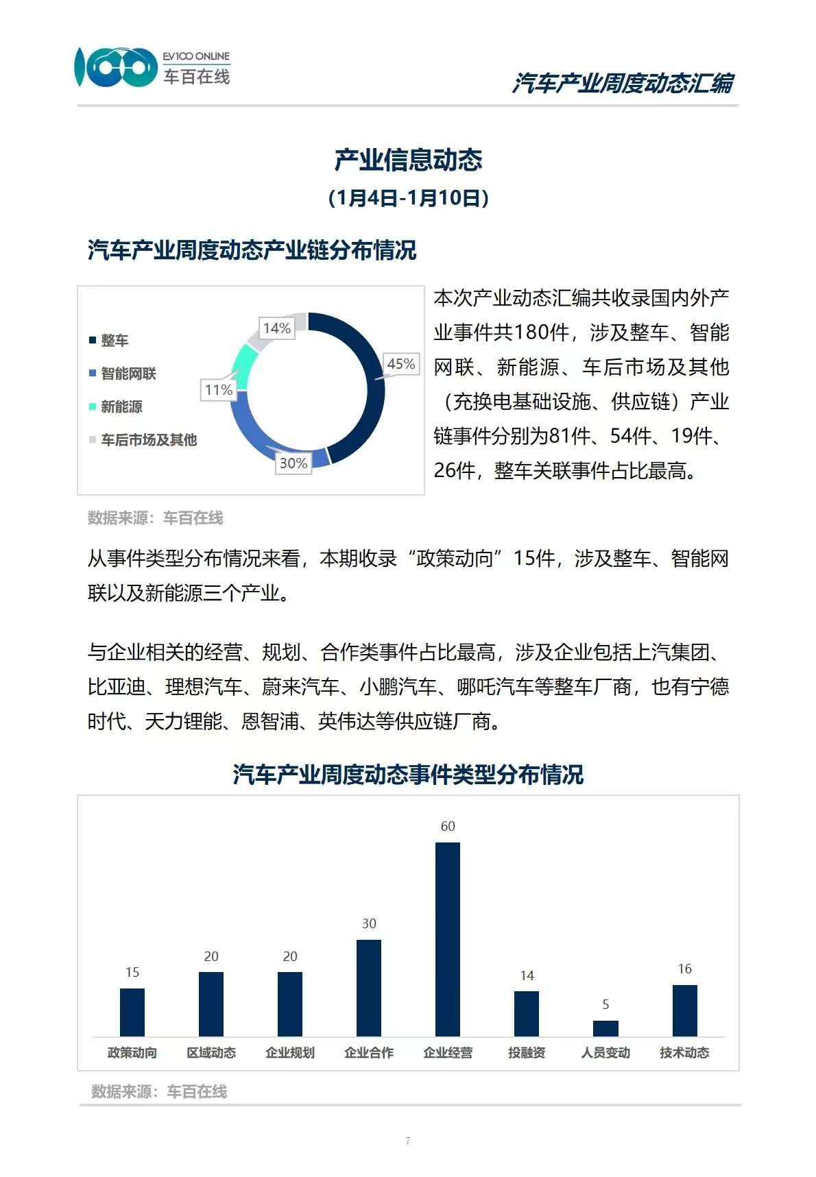 从事件类型分布情况来看,本期收录“政策动向”15件,涉及整车、智能网联以及新能源三个产业。