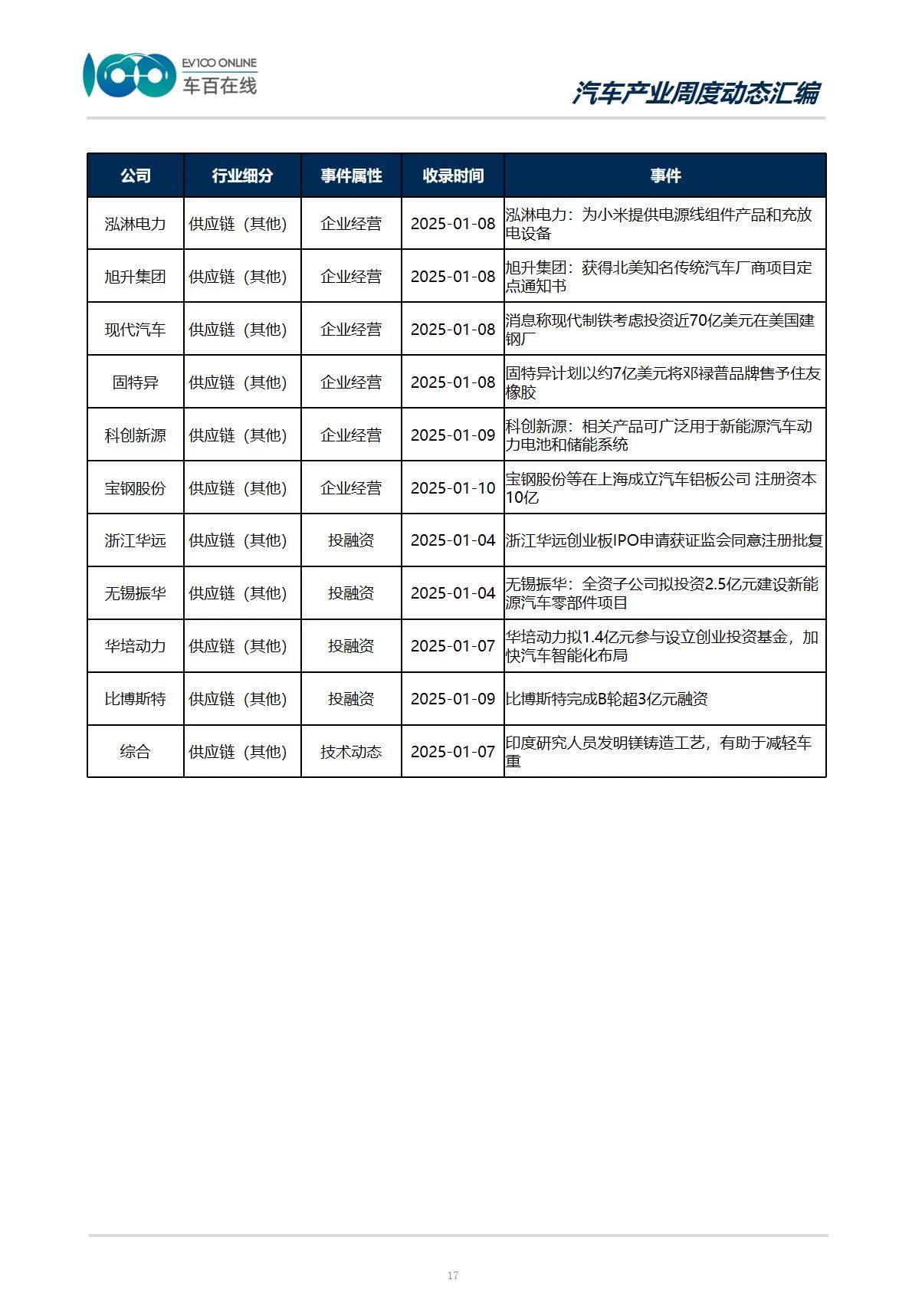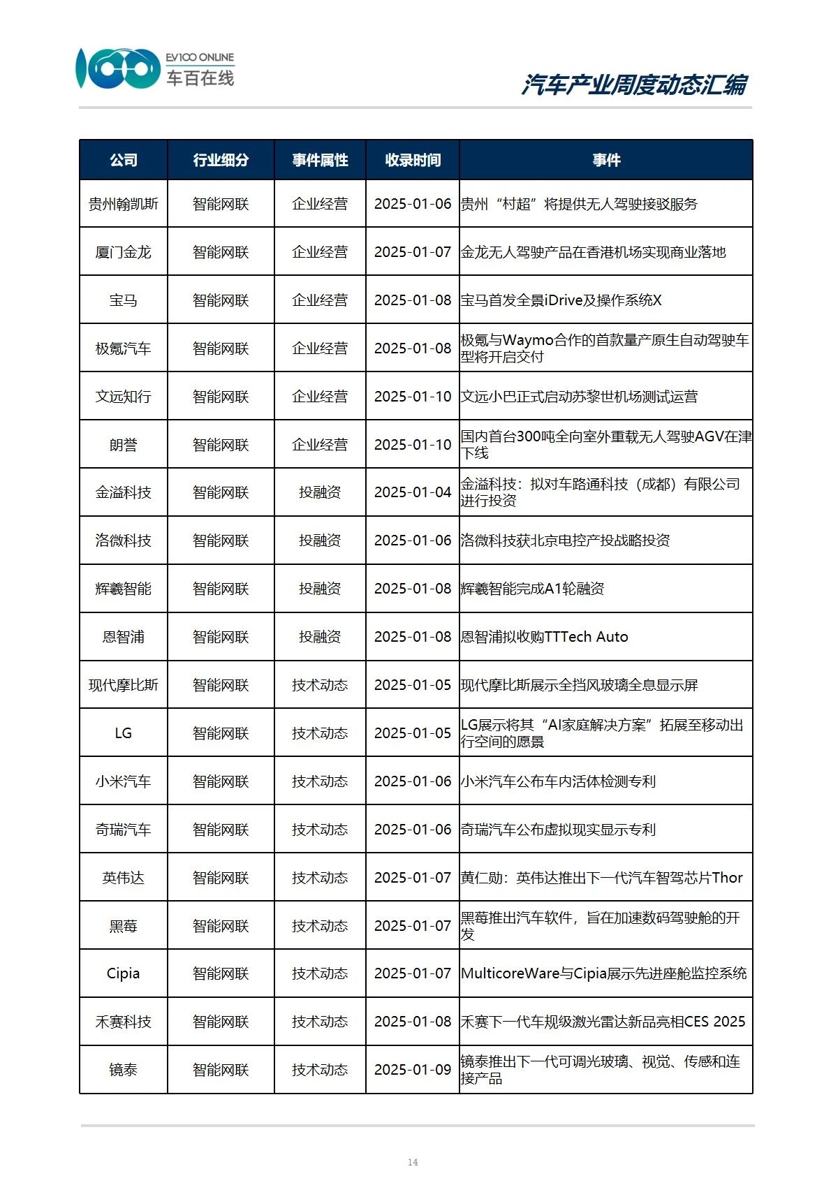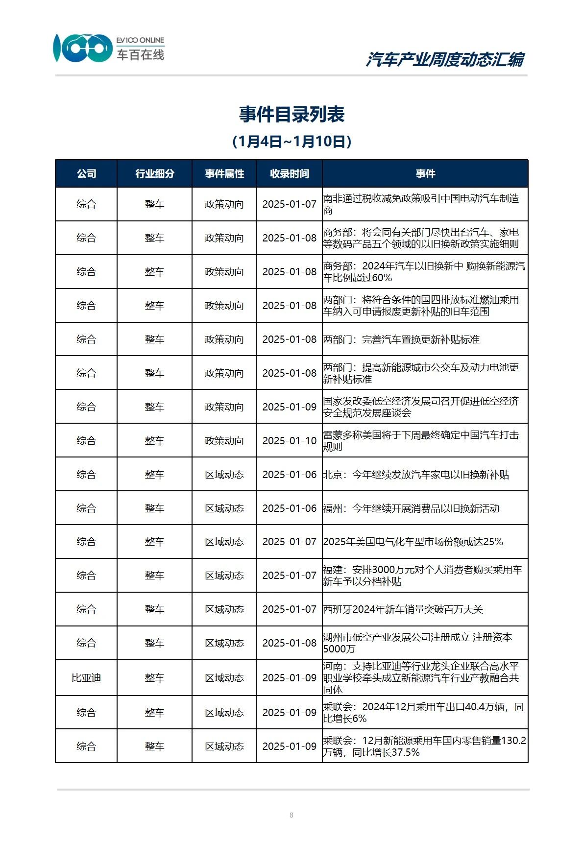 从事件类型分布情况来看,本期收录“政策动向”15件,涉及整车、智能网联以及新能源三个产业。