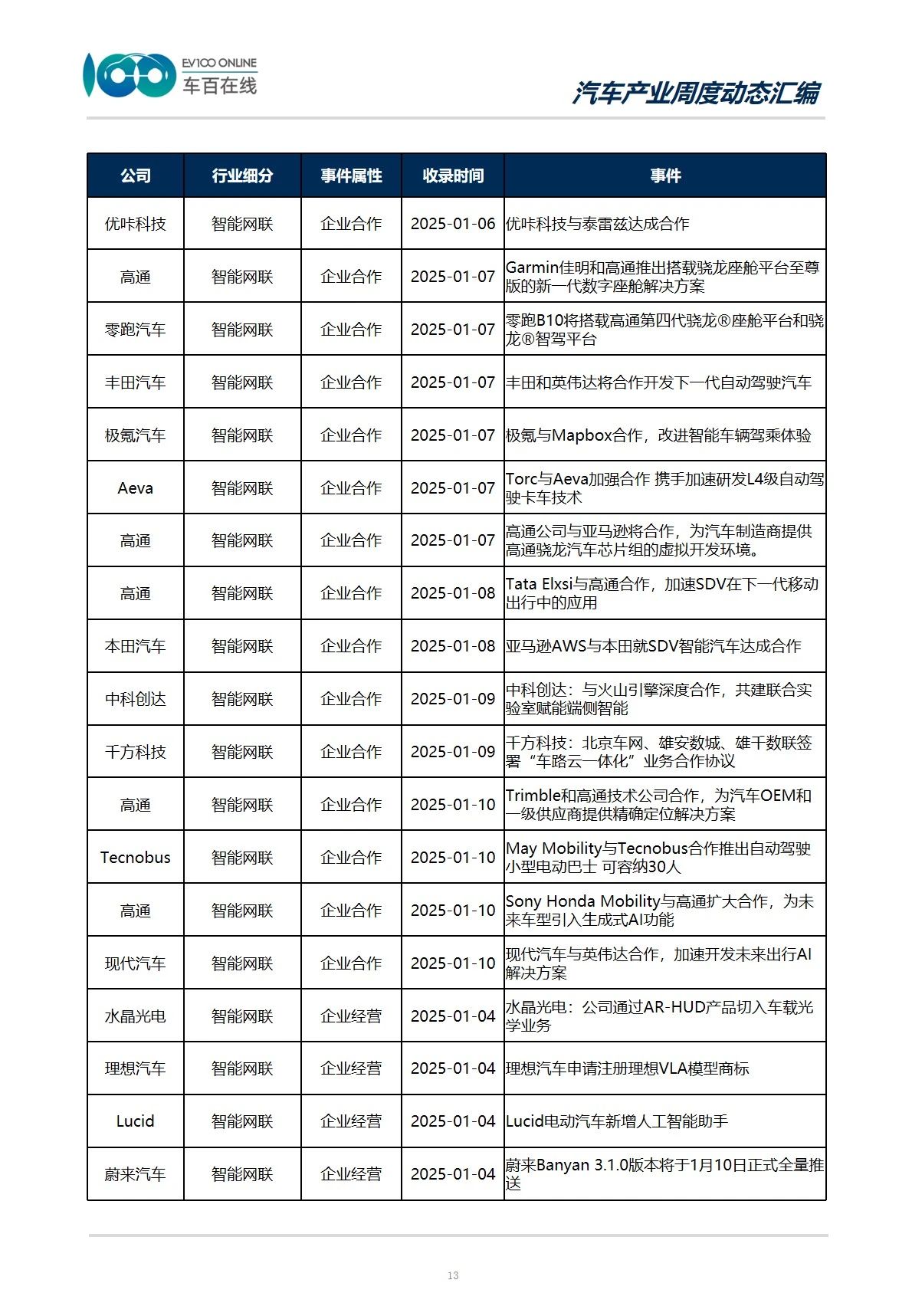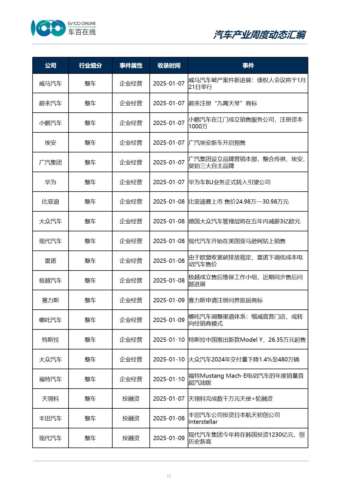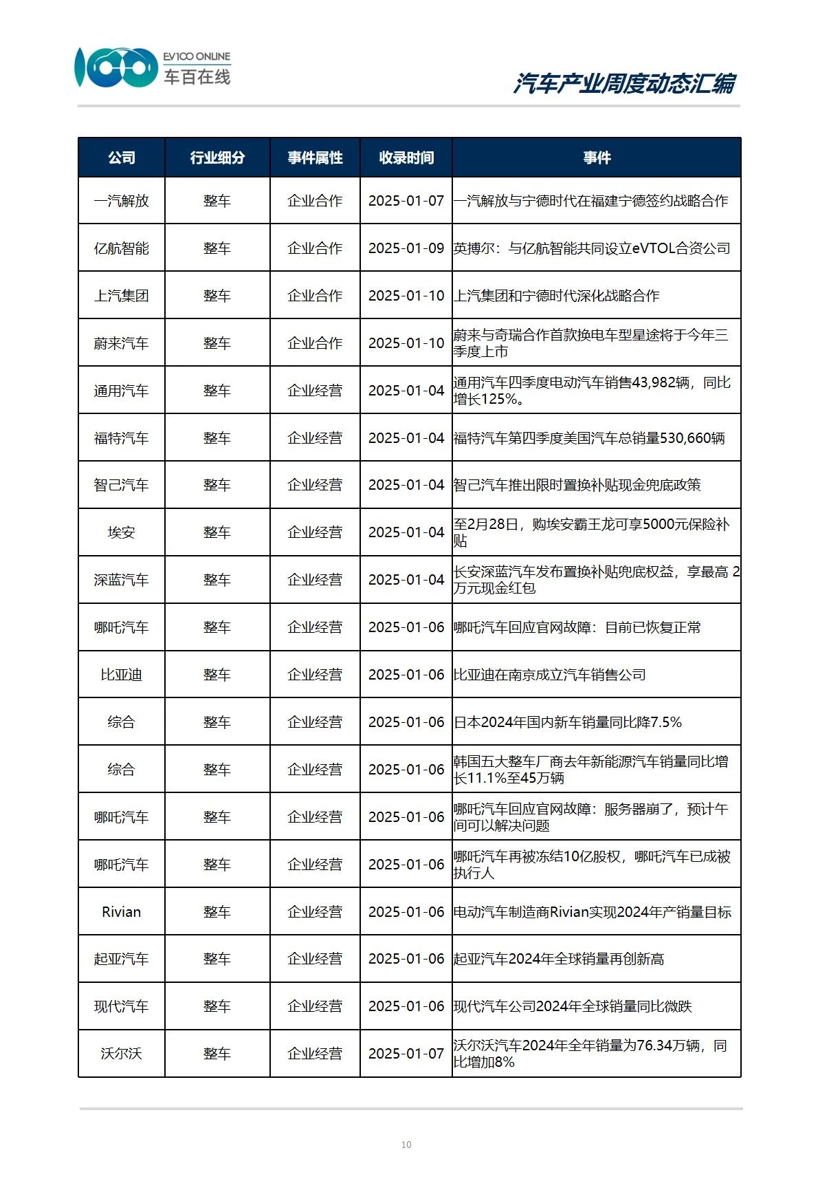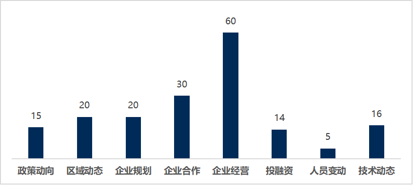 与企业相关的经营、规划、合作类事件占比最高,涉及企业包括上汽集团、比亚迪、理想汽车、蔚来汽车、小鹏汽车、哪吒汽车等整车厂商,也有宁德时代、天力锂能、恩智浦、英伟达等供应链厂商。